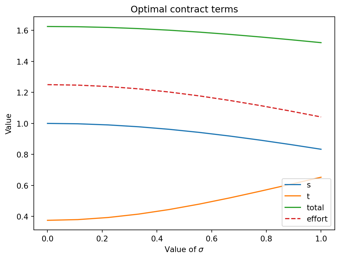 The following graphs shows the comparative statics of the optimal contract terms and utilities for different values of \sigma.