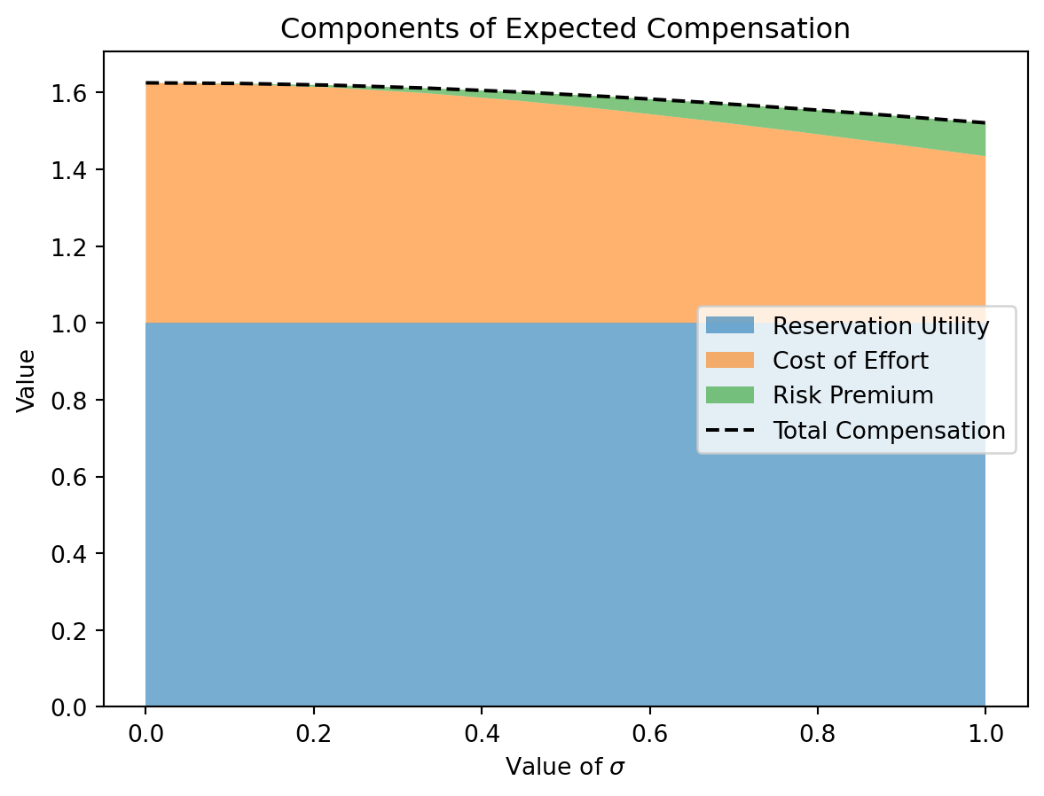 We can also decompose the expected compensation into its components: reservation utility, cost of effort, and risk premium.