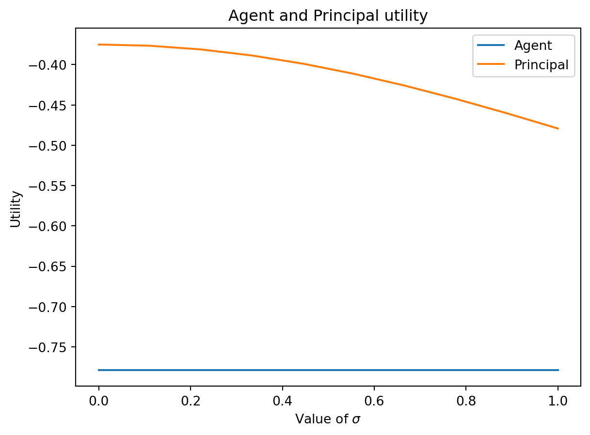 # plot the utility of the agent and principal for different values of sigmau_agent =-np.exp(-eta*(t+s*effort-0.5*c*effort**2-s**2*eta*sigma**2/2)) u_principal = effort-t-s*effortplt.plot(sigma, u_agent, label='Agent')plt.plot(sigma, u_principal, label='Principal')plt.legend()plt.xlabel('Value of $\sigma$')plt.ylabel('Utility')plt.title('Agent and Principal utility')plt.show()