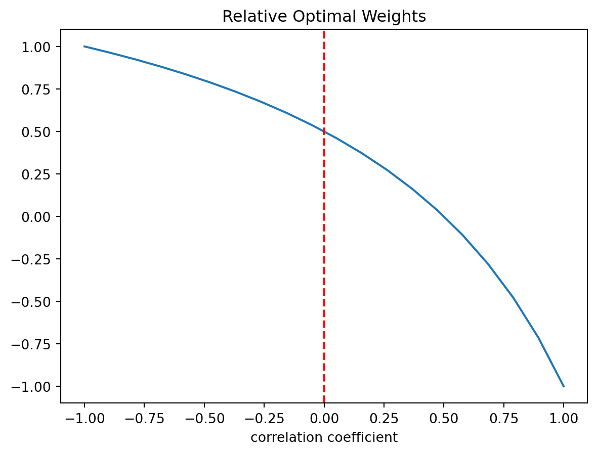# plot the beta_x/beta_y for different values of rho rho = np.linspace(-1,1,20)sigma_y =1.25sigma_x =1.25# subplot for rhobeta_rho = (1-2*(rho*sigma_x*sigma_y)/(sigma_y)**2)/(sigma_x**2)*(sigma_y**2)/(2-(rho*sigma_x*sigma_y)/(sigma_x)**2)plt.plot(rho, beta_rho)plt.xlabel('correlation coefficient')# add vertical line in x=0plt.axvline(x=0, color='r', linestyle='--')## add subtitleplt.title('Relative Optimal Weights')plt.show()