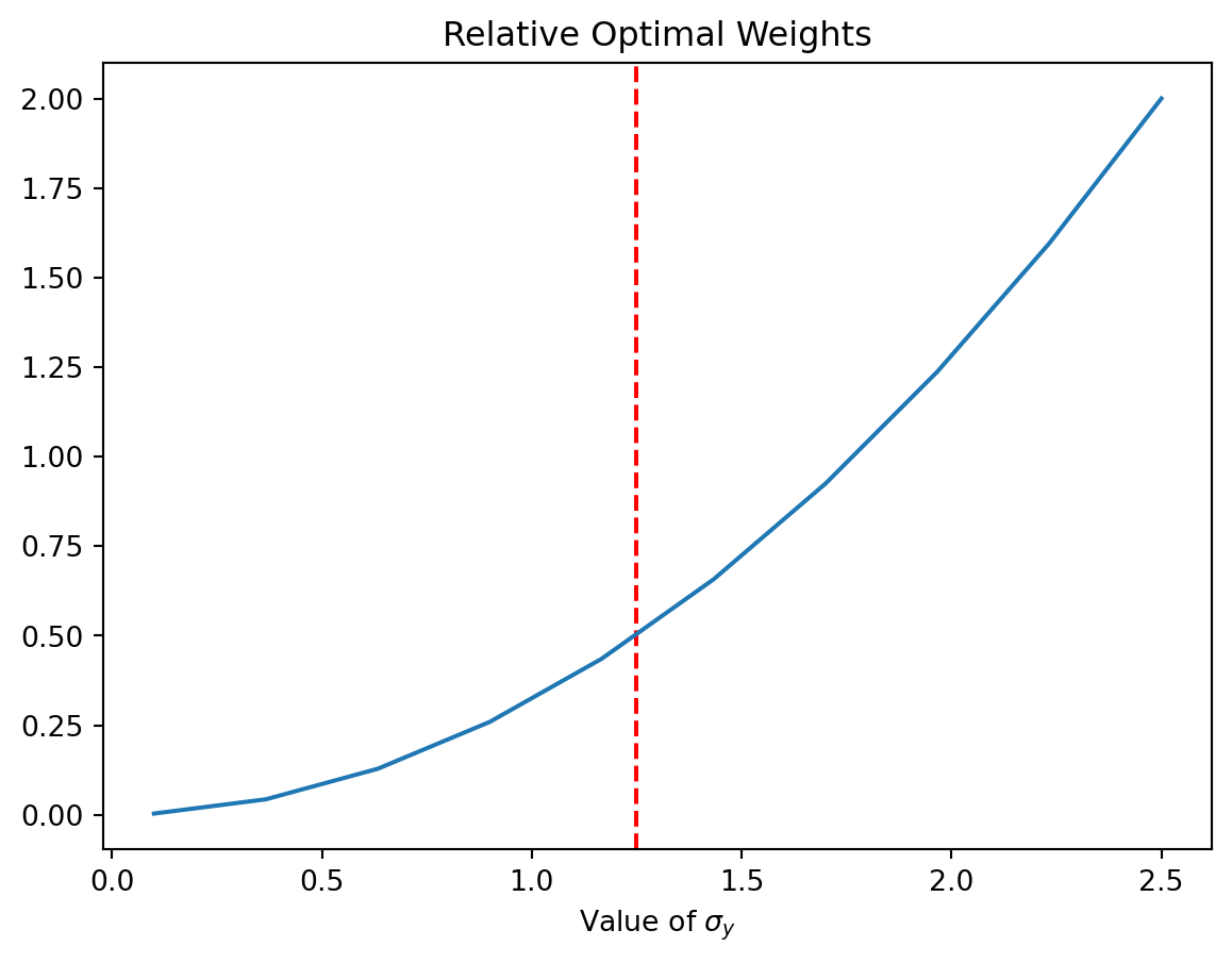 Let’s see the comparative statics of the optimal weights for different values of \rho and \sigma_y. First, let’s assume that both metrics have the same noise, \sigma_x=\sigma_y=1.25.