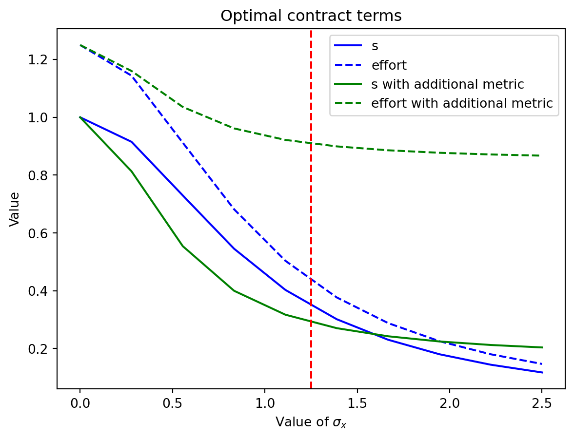We see that the introduction of the additional metric y leads to two effects. First, the optimal effort increases regardless of how noisy is the outcome. Second, performance-related incentive s is lower than the original case for low values of outcome volatility, but is larger when this volatility is high. This is because for low outcome volatility, the new metric is more sensitive to the agent’s effort than the output x alone, being more efficient to motivate the agent. However, for high outcome volatility, the new metric is less sensitive to the agent’s effort, so the principal needs to increase the incentive to motivate the agent.